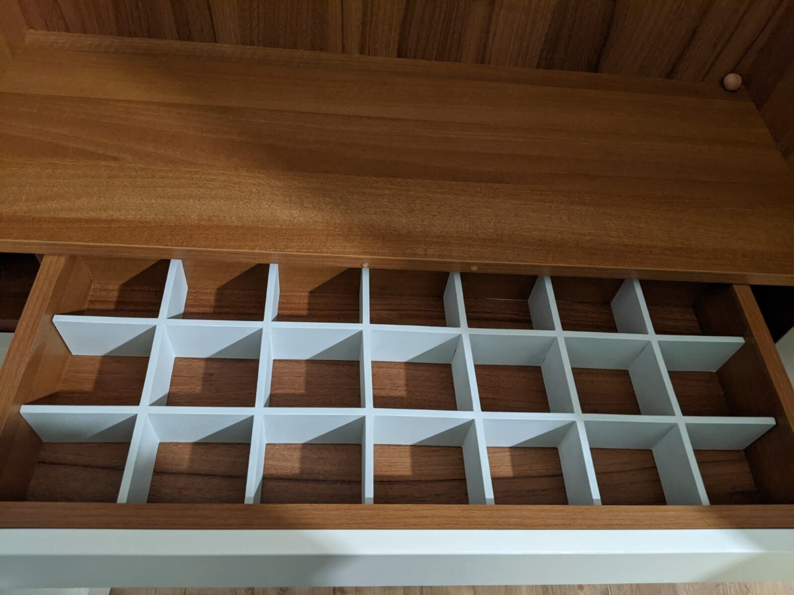 Build-in bedroom wardrobe featuring dual hanging compartments, shelves and multiple soft-pull drawers , combined with open shelves, designed for maximum practicality and modern efficiency.